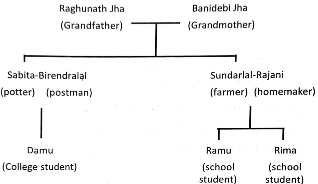 [আমি রিমা। আমার দাদু হলেন রঘুনাথ ঝা এবং ঠাকুমা বানীদেবী ঝা। আমার বাবা-মা হলেন সুন্দরলাল ঝা এবং রজনী ঝা। রামু হল আমার ভাই। আমরা হলাম ছাত্রছাত্রী এবং স্কুলে যাই। আমার পিসিমা, সবিতা হলেন একজন কুমোর এবং তাঁর স্বামী বীরেন্দ্রলাল হলেন একজন পিয়োন। তাঁদের একমাত্র ছেলে দামু, যে বর্তমানে একজন কলেজ ছাত্র।]